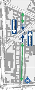 Mit der Fahrbahnbreite von 5,50 m sind auch die Verantwortlichen nicht glücklich. Nach ihren ursprünglichen Überlegungen sollte die Fahrbahn in den Zweirichtungsabschnitten 5,0 m breit werden, um genügend geschwindigkeitsdämpfend zu wirken. Die Feuerwehr fordere aber mittlerweile bei Neuplanung bzw. Umbau eine Fahrbahnbreite von 5,5 m Metern um bei einem Brand von Häusern schnell an diese anleitern zu können. Die immer schwerer gewordenen Pkw seien im Ernstfall nicht mehr so leicht wie früher aus dem Weg zu schaffen. Bei der vorgesehenen Lösung für das Parken werden gegenüber dem Bestand in den Parkierungsbereichen die nutzbare Gehwegbreiten um 70 cm verringert: auf den jeweiligen Längsparken Abschnitten durch bauliche Verringerung (Versetzen des Bordsteins näher zur Häuserkante), auf den Querparken Abschnitten durch den Überhang der parkenden Fahrzeuge über den Gehweg.