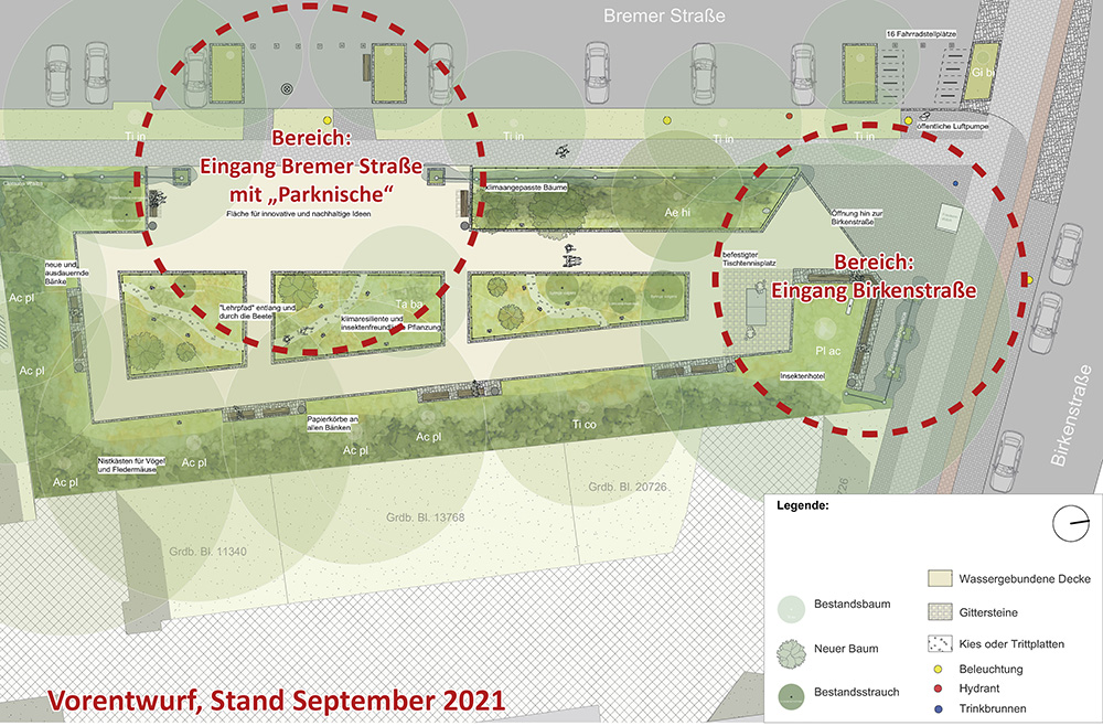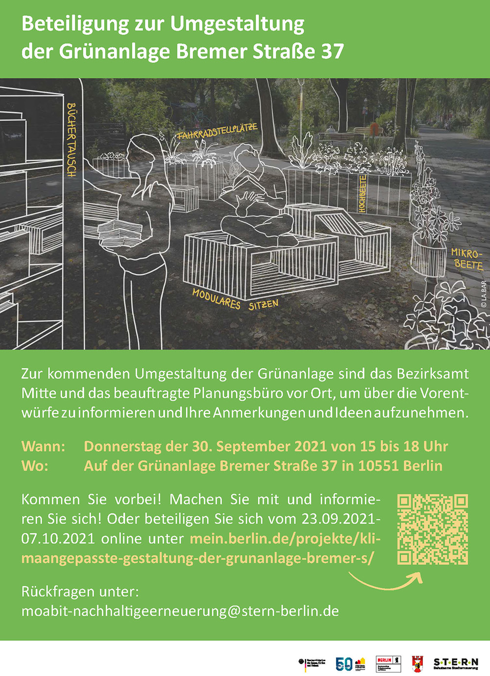 Das Bezirksamt Mitte von Berlin plant die Sanierung und Umgestaltung der Grünanlage Bremer Straße 37. Ausdrückliches Ziel ist es, die Attraktivität zu erhöhen und unter Berücksichtigung des stattfindenden Klimawandels den Freiraum umzugestalten. Durch die Weiterentwicklung soll eine höhere Einsehbarkeit innerhalb der Grünanlage erreicht und bessere Aufenthaltsmöglichkeiten geschaffen werden. Bei Veranstaltungen im Vorfeld hatten einige Anwohner*innen den Ort als "Angstraum" bezeichnet. Finanziert wird das Bauvorhaben aus Fördermitteln des Programms Nachhaltige Erneuerung im Fördergebiet Tiergarten-Nordring/Heidestraße. Die Realisierung der Planungen soll bis 2023 erfolgen, wobei die klimaangepasste Umgestaltung dieser kleinen Fläche als Startermaßnahme für den gesamten "Nahraum Bremer Straße", bei dem es nicht nur um Grün- und Freiflächen, sondern auch um Verkehr und Straßenraum sowie soziale und kulturelle Infrastruktur geht.