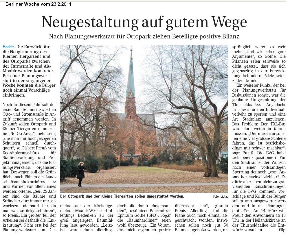 Artikel über die Planungswerkstatt in der Berliner Woche vom 23.2.2011, der allerdings einen kleinen Fehler hat, weil er von nur 50 zu fällenden Bäumen spricht. Im Nachhinein konnte nicht mehr geklärt werden, wer diese falsche Zahl in die Welt gesetzt hat.
