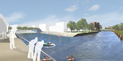 An der Heidestraße soll ein lebendiges urbanes Viertel entstehen, zweimal so groß wie der Potsdamer Platz, eine Mischung aus Büros, Gewerbe, Wohnen, Kultur und Freizeit. Hochhäuser sind am Nordhafen und an der Invalidenstraße gegenüber des Hauptbahnhofs vorgesehen. Insgesamt sind etwa 520.000 qm Bruttogeschossfläche möglich (in manchen Texten ist auch von bis zu 650.000 qm BGF die Rede), davon ca. 1.200 Wohnungen, das sind 1.600 bis 2.400 neue Bewohner. 10.000 bis 14.000 Arbeitsplätze könnten entstehen. Die Heidestraße stellt man sich als grünen Boulevard vor, mit drei Reihen Alleebäumen. Die Wohnungen werden abseits der Hauptstraße liegen. Besonders interessant ist an diesem Konzept das neue Hafenbecken (Bild oben) am Spandauer Schifffahrtskanal ungefähr in der Mitte zwischen Humboldt- und Nordhafen, die breiten Freiflächen entlang der Wasserstraße, eine Brücke über die Bahntrasse als Verbindung nach Moabit, zwei neue Brücken über den Kanal sowie weitere verkehrsplanerische Details. Die Entwürfe waren etwa einen Monat im Pavillon auf dem Washingtonplatz ausgestellt. Bei der 3. Standortkonferenz Heidestraße am 22. April 2008 war der Tape Club fast überfüllt. Es wurde lebhaft diskutiert. Das Protokoll dieser Veranstaltung kann hier heruntergeladen werden.