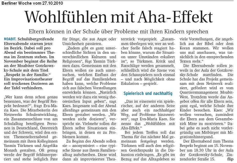 In dieser Veranstaltung wird auch theoretisches Wissen vermittelt, aber auf eine ernsthaft unterhaltsame Art und Weise: mit Improvisationstheater. Eltern können Probleme mit ihren Kindern zur Sprache bringen, ohne sich selbst bloßgestellt zu fühlen. Zu Beginn schreiben Eltern auf, was bei ihnen in der Familie schon im Streit um das Thema Respekt vorgekommen ist - typische Situationen aus ihrem Familienalltag. Jeder für sich und anonym. Die Schauspieler entwickeln daraus kleine Szenen, die vorgespielt werden. Dann wird gemeinsam in der Gruppe überlegt, wie die "Verhandlung von Regeln" in der entsprechenden Situation besser hätte gelingen können. Kritik und Ratschläge werden gesammelt. Auch das wird dann wieder gespielt. Eva-Maria Kaes und ihre Mitarbeiterinnen Yasemin Türkmen und Angelika Monath vom Netzwerk Schulentwicklung erwarten bessere Ergebnisse durch "Wohlfühlen mit Aha-Effekt"., wie sie bei der Vorstellung im Oktober beim Stadtteilplenum Moabit West erklärten.
