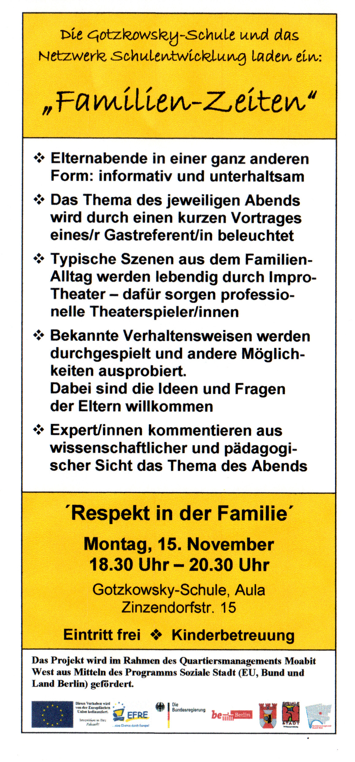 Respekt in der Familie - kein einfaches Thema für einen Elternabend. Denn jeder Einzelne, jede Familie wird etwas ganz Anderes darunter verstehen und völlig verschiedene Interpretationen und Erfahrungen einbringen können. Dennoch wird es wohl keine Familie geben, in der über Respekt nicht schon Auseinandersetzungen in welcher Form auch immer vorgekommen sind. Während es den einen wichtig ist, dass ein Kind Respekt nur lernen kann, wenn es selbst von Anfang an mit Respekt und Liebe aufgezogen wird, werden andere mehr darauf hinweisen, dass die heutige Jugend den Respekt vor den Älteren verloren habe. Was bedeutet eigentlich Respekt? Muss man ihn sich durch eigenes gutes Vorbild erarbeiten oder reicht es aus Älter zu sein oder eine bestimmte Stellung in der Familie zu haben? Kann durch Angst wirklicher Respekt erzeugt werden? Fragen über Fragen. Doch wird bei desem Elternabend nicht theoretisch diskutiert und schon gar keine bestimmte Moral verordnet. Zu dem ersten themenzentrierten Elternabend in der Aula der Gotzkowsky-Grundschule, Zinzendorfstraße 15, am 15. November um 18:30 Uhr sind nicht nur interessierte Eltern dieser Schule sondern Eltern aus dem ganzen Bezirk Mitte eingeladen.