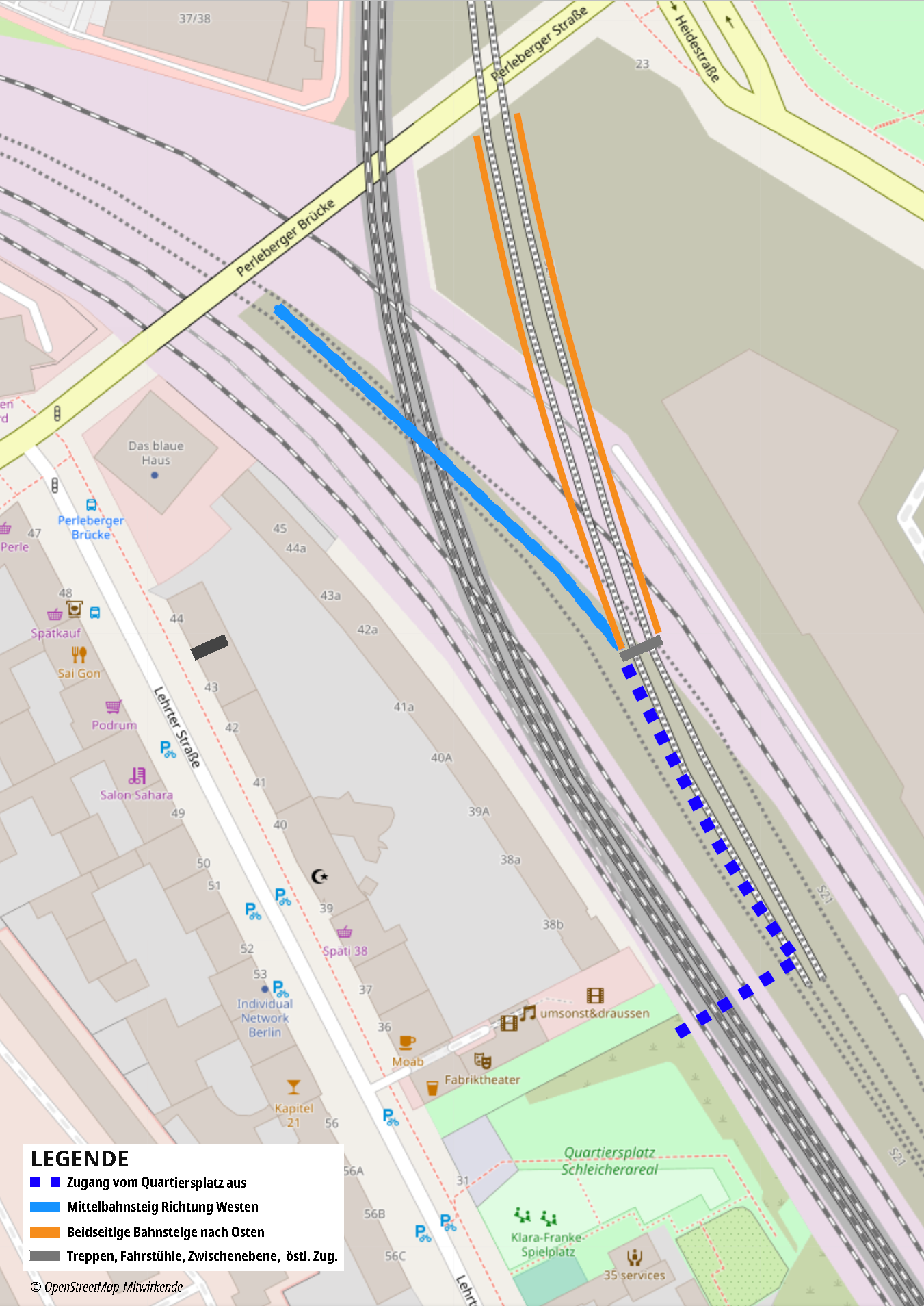 Der Betroffenenrat Lehrter Straße schlägt in einem Brief an die DB Netz, SenUMVK, Politiker*innen des Berliner Abgeordnetenhauses und der BVV Mitte angesichts der beginnenden/ begonnenen Vorplanung die Prüfung eines Zugangs vom Quartiersplatz Lehrter Straße 31-34 aus vor. Der Zugang könnte im nördlichen Bereich des Quartiersplatzes unterirdisch unter den von Westen kommenden Fern- und Regionalbahngleisen bis zu dem künftigen Bahnsteig des Haltepunkts der von Westen kommenden S-Bahn-Strecke geführt werden und von da aus auch zu dem in der Hochlage befindlichen Bahnsteig für die vom Hauptbahnhof nach Osten führende Strecke angebunden werden. In der Lehrter Straße wohnende oder arbeitende Menschen sowie Besucher*innen des Sportparks Poststadion könnten den Haltepunkt so gut erreichen und müssten nicht einen langen Umweg über die Perleberger Brücke zu eventuellen Zugängen nehmen oder anderen – noch weiter entfernten potenziellen Zugängen zum Haltepunkt. Da der Quartiersplatz über den entlang der Bahn Richtung Süden geplanten „Döberitzer Grünzug“ auch die Klara-Franke-Straße anbindet, an der die bahnseitig errichteten Häuser des Mittenmang Quartiers liegen, hätte diese eine besonders günstige Anbindung, aber auch die Nutzer*innen bzw. Besucher*innen des Sportparks Poststadion würden davon profitieren.