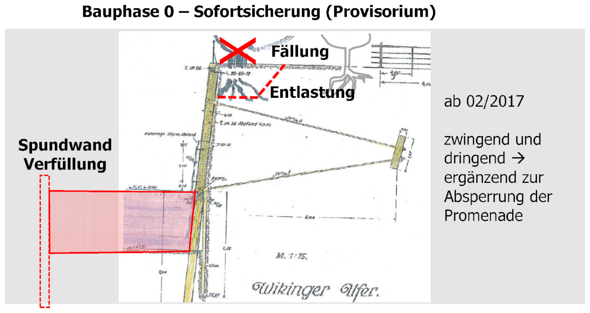 Die auf diese Weise entstehende Konstruktion bildet die Grundlage für die anschließend geplante eigentliche Sanierung der Uferwand. Diese ist nicht Teil der aktuellen Maßnahme. Planung und Ausschreibung der Sanierungsarbeiten sind derzeit in Vorbereitung.