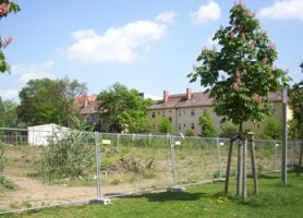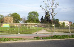 An den bereits gebauten Grünzug schließt sich die kleine Stichstraße zwischen Kleingärten und Lehrter Straße 6-8 an und über das freie Gelände konnte man bisher auch ohne Döberitzer Grünzug bis zur Heidestraße und bis zum Hauptbahnhof auf Trampelpfaden durchlaufen. Etwa vor zwei Wochen wurde hinter den Häusern fast der gesamte Bereich durch einen Bauzaun abgesperrt, quer über den Trampelpfad und bis an die Sanddornbüsche heran, die beim Bau des Geschichtspark Zellengefaängnis gepflanzt wurden.