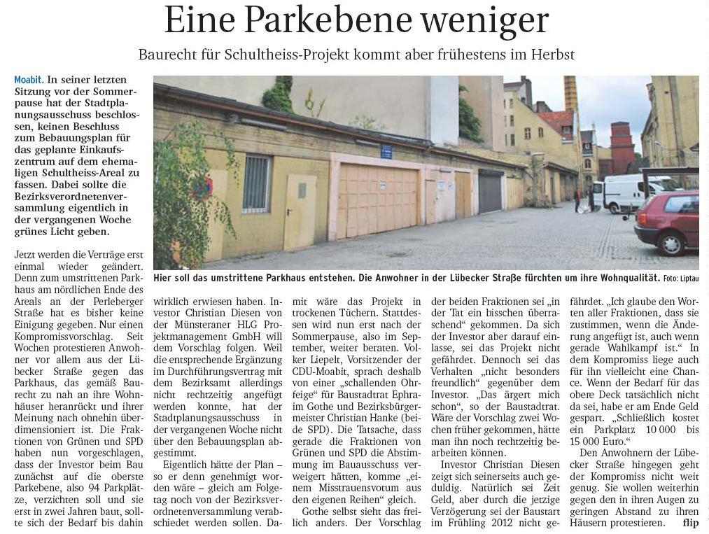 Die Entscheidung ist auf Herbst vertagt, hier der Artikel in der Berliner Woche vom 29.6.11: Eine Parkebene weniger.