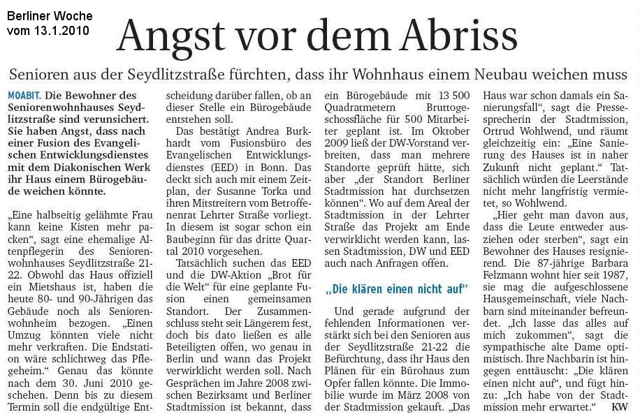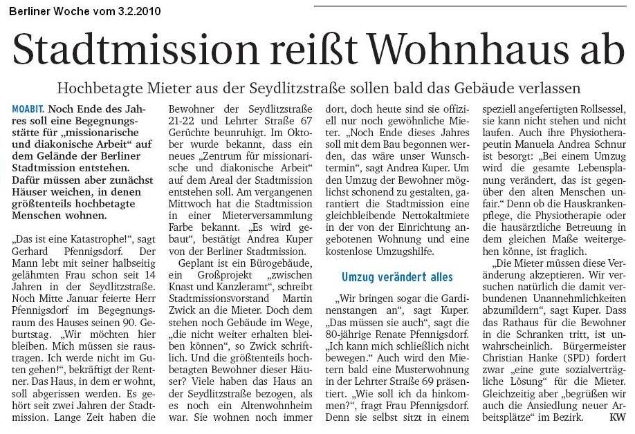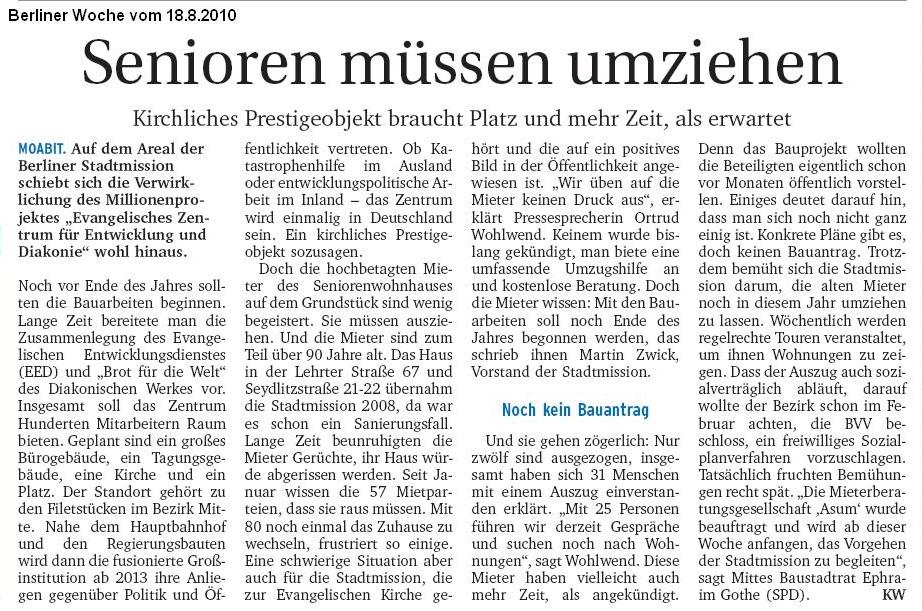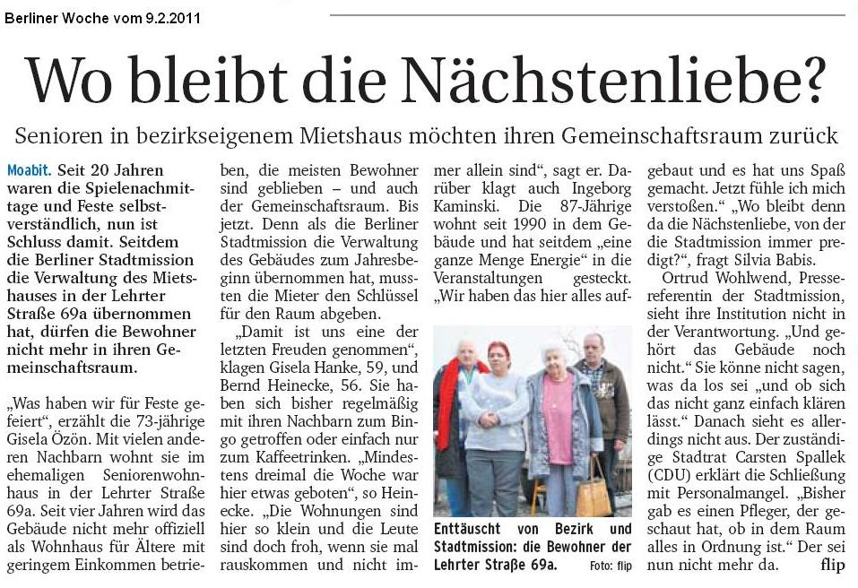 Jetzt kommt das Projekt nicht, von 57 Wohnungen sind bis auf etwa 16 alle entmietet. Viele Senioren sind in die Lehrter Straße 69 A umgesetzt worden. Und was passiert dort? Zum Jahreswechsel wurde die Verwaltung des bezirkseigenen Mietshauses an die Berliner Stadtmission abgegeben und die Senioren mussten ihre Schlüssel für den Gemeinschaftsraum abgeben. Die Berliner Woche fragt: Wo bleibt die Nächstenliebe? Zum abgesagten Projekt nach Umsetzung der meisten Senioren auch das MieterMagazin, Ausgabe Jan./Feb. 2011.