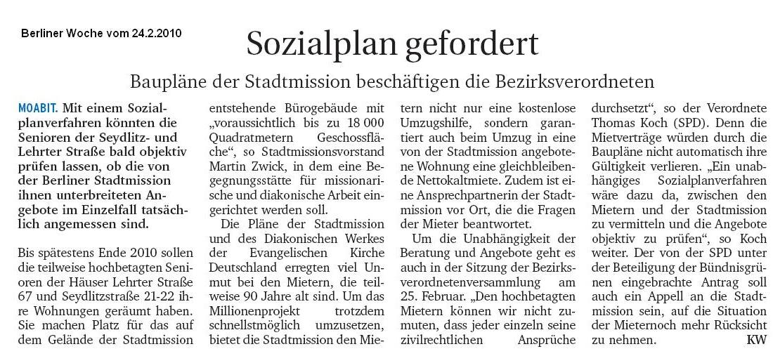 Anfang 2008 hatte die Stadtmission das früher bezirkseigene Seniorenwohnhaus vom Liegenschaftsfonds Berlin gekauft. Aus Bewohnern eines Seniorenwohnhauses wurden damit ganz normale Mieter. Trotz des im September 2008 gegebenen Versprechens die Betroffenen und die Nachbarschaft zeitnah über alle Entwicklungen und Planungen zu informieren, dauerte das bis zum 26. Januar 2010 (Mieterversammlung) und 2. Februar 2010 (Sitzung des Betroffenenrats Lehrter Straße). Damit ist nun offiziell: das Eckgebäude wird abgerissen und einem Neubau mit bis zu 18.000 Quadratmeter Nutzfläche für Büros, Tagungsräume, Hostelbetten, Kirche und vielleicht auch Wohnungen weichen. Pläne wurden noch nicht vorgestellt. Die Berliner Stadtmission hatte seit September 2009 einen Wettbewerb mit sechs Architekturbüros durchgeführt. Am 20. Dezember 2009 tagte ein Auswahlgremium, an dem auch Mittes Stadtrat für Stadtentwicklung, Ephraim Gothe, teilgenommen hat, wie er in der BVV (Bezirksverordnetenversammlung) am 21. Januar 2010 berichtete. Zwei der Entwürfe werden zur Zeit weiter bearbeitet. Und erst danach wird die Berliner Stadtmission in einer öffentlichen Veranstaltung die Pläne vorstellen. "Keiner der Entwürfe kommt ohne den Abriss des Eckhauses aus. Doch vor Weihnachten wollten wir die Mieter nicht beunruhigen, deshalb fand die Mieterinformationsveranstaltung erst im Januar statt", so Zwick.
