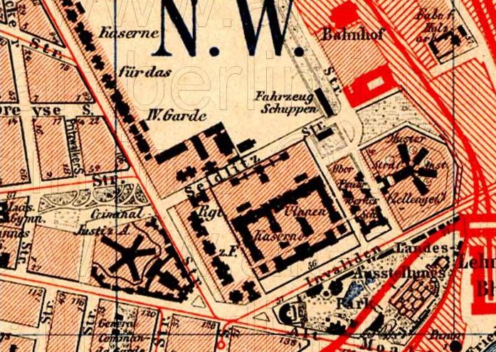 Die Skulpturen orientieren sich in ihrer Grundidee am "Ulanenstein" (1922/23) von Josef Limburg (1874-1955), Claire-Waldoff-Promenade (Bild 1 der Bildergalerie). Dieses Denkmal war nach dem 1. Weltkrieg vor der Ulanenkaserne aufgestellt worden, die mit ihren Pferdeställen für fast 700 Pferde und weiteren Nebengebäuden fast den ganzen Block an der Invalidenstraße bis zur Seydlitzstraße einnahm. Hier eine Karte von 1893. Das 2. Garde-Ulanen-Regiment war 1918 aufgelöst worden.