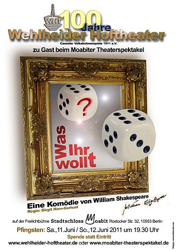 Doch zum Saisonauftakt spielen dieses Jahr nicht die Darsteller dieser freien Moabiter Theatergruppe, sondern das "Wehlheider Hoftheater" eine befreundete Theatergruppe aus Kassel, die in diesem Jahr ihren 100. Geburtstag feiert. Gerade der richtige Anlass für die Kasselaner Theatergruppe, eine Reise nach Moabit zu machen und hier die Moabiter und andere Gäste am Pfingstwochenende mit dem Theaterklassiker "Was ihr wollt" von Shakespeare zu erfreuen.
