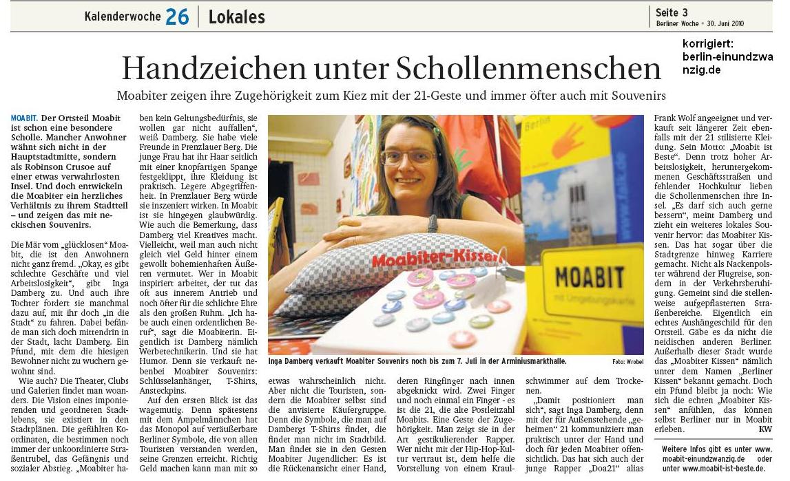Der Stand in der Arminiusmarkthalle ist jetzt geschlossen, aber die Moabit-Souvenirs werden weiterhin über die Webseite www.berlin-einundzwanzig.de vermarktet, wie K. Wrobel in der Berliner Woche berichtet. Auf dem diesjährigen Turmstraßenfest macht Inga Damberg wieder einen Stand am Freitag und Samstag.