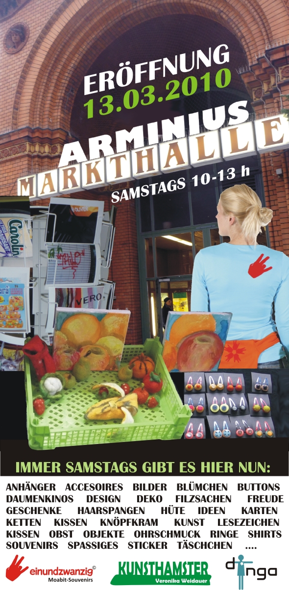 Einen gemeinsamen Stand der Label einundzwanzig Moabit, Kunsthamster und dinga wird es jeden Samstag von 10 - 13 Uhr in der Arminiusmarkthalle geben. Zu finden sind: Anhänger, Accessoires, Blider, Blümchen, Buttons, Daumenkinos, Design, Deko, Filzsachen, Freude, Geschenke, Haarspangen, Hüte, Ideen, Karten, Ketten, Kissen, Knöpfkram, Kunst, Lesezeichen, Obst, Objekte, Ohrschmuck, Ringe, Shirts, Souvenirs, Spaßiges, Sticker, Täschchen ... Hier den Flyer herunterladen.