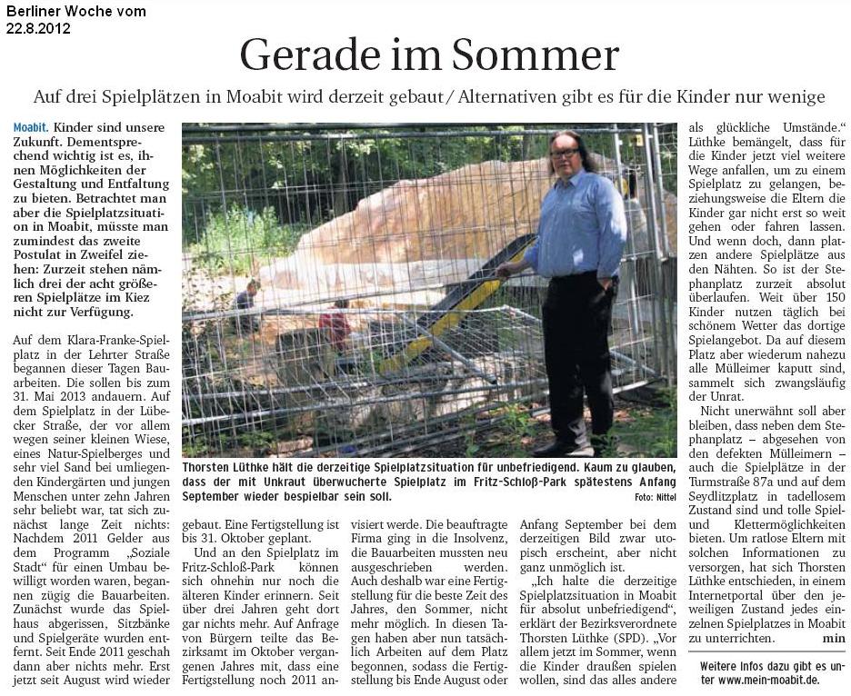 Super! Auf dem Seydlitzspielplatz soll mit Geldern aus dem Stadtumbau West eine Trinkwasserpumpe gebaut werden, Realisierung 2014 oder 2015 (Wasserspielplatz im Fritz-Schloß-Park - Drs. 1046/IV). Artikel aus der Berliner Woche dazu.