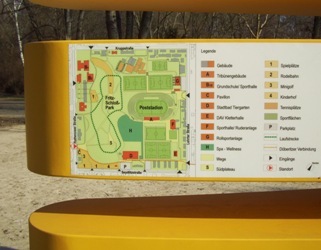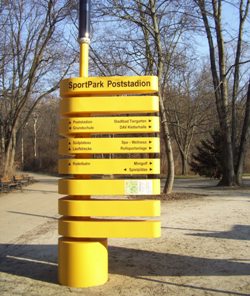 Mit den orangen Eingangsstelen neben dem Minigolf-Pavillon tauchte im letzten Herbst plötzlich der neue Name auf: „SportPark Poststadion“. Auf den Stelen findet man auch eine kleine Karte des Geländes zwischen Rathenower / Krupp / Lehrter / Seydlitzstraße und hier ist noch der Name „Fritz-Schloß-Park“ zu lesen. Pfeile führen die Besucher zur Laufstrecke, zur Rodelbahn, zur Rollsportanlage, zur Grundschule, zu den Spielplätzen und zum Minigolf-Platz, auch wenn sie eigentlich schon davor stehen.Hinweispfeile zur DAV-Kletterhalle und zu Spa-Wellness gibt es auch schon, auch wenn diese erst in der Zukunft gebaut werden.