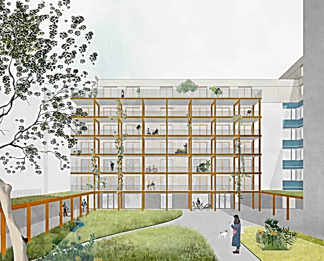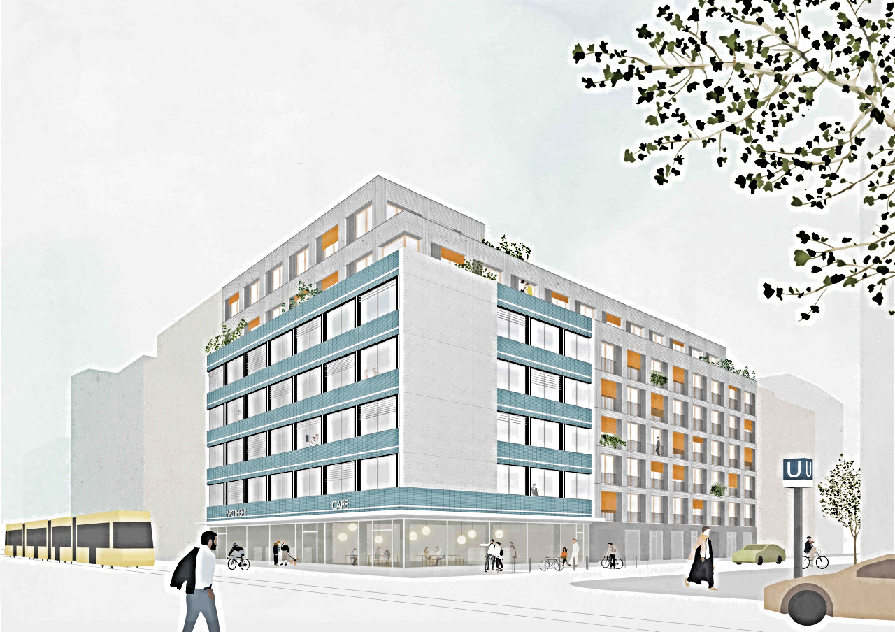 Die Wettbewerbsaufgabe umfasst ein Konzept zur Sanierung und Aufstockung eines Ärztehauses der Nachkriegsarchitekten Schwebes-Schoszberger, sowie die Errichtung eines mehrgeschossigen Holz-Wohnhauses neben dem Bestand. Unser Entwurf sieht vor, dass der historische Bau von Paul Schwebes der Protagonist an der Blockecke bleibt, und dass er nicht nur energetisch saniert, sondern gestalterisch möglichst originalgetreu wiederhergestellt wird – als wertvolles Zeugnis des Optimismus und Pragmatismus, der Leichtigeit und Eleganz der West-Berliner Nachkriegsarchitektur. Das neue Gebäudeensemble wächst respektvoll um ihn herum und sorgt für eine gegliederte, passepartoutartige Rahmung.