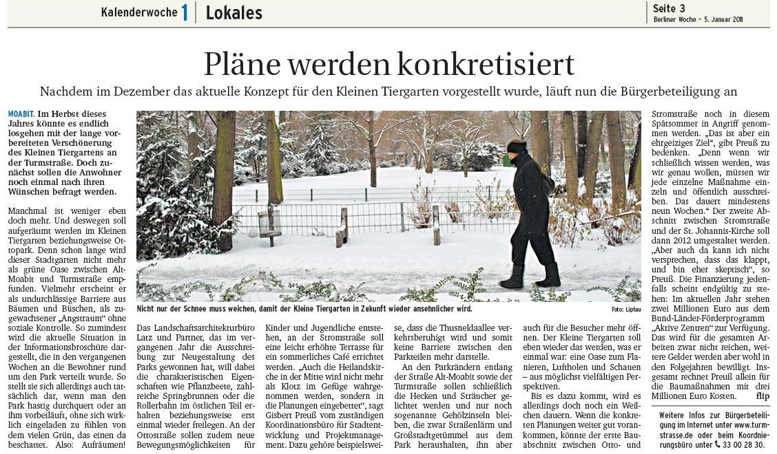 Am Dienstag, den 7. Dezember 2010, 19 Uhr findet im Gemeindesaal der Ev. Kirchengemeinde Moabit West, Ottostraße 16, eine öffentliche Informationsveranstaltung zur geplanten Umgestaltung des Kleinen Tiergartens/Ottoparks statt. Auf Einladung (PDF) des Bezirksamts Mitte und des Beauftragten für die Durchführung des "Aktiven Stadtzentrums Turmstraße", dem "Koordinationsbüro für Stadtentwicklung und Projektmanagement" - kurz KO-Büro, stellen Vertreter des Landschaftsarchitekturbüros Latz und Partner ihre Vorentwurfsplanung vor und diskutieren diese mit Anwohnern und Nutzern. Mitglieder der "AG Grün" der Stadtteilvertretung Turmstraße stellen ihre Ideen zur Parkgestaltung vor. Diese Infoveranstaltung stellt den Auftakt einer Veranstaltungsreihe von insgesamt vier Veranstaltungen bis Mitte März 2011 dar.
