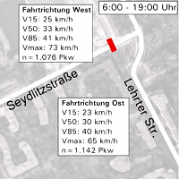 Geschwindigkeitsmessungen in der Seydlitzstraße, die als Tempo-30 Zone ausgewiesen ist, ergaben dass die Geschwindigkeit, die von 85 % aller Fahrzeuge unterschritten bzw. eingehalten wird (sogenannter V85 Wert), bei 40-41 km/h liegt. Die höchste gemessene Geschwindigkeit betrug 71 km/h. Weniger als 50 % der Fahrzeugführer*innen hielten sich an die Tempo-30 Regelung. Die Seydlitzstraße weist damit einen hohen Anteil von mit überhöhter Geschwindigkeit fahrenden Fahrzeugen auf, was für geschwindigkeitssenkende bauliche Maßnahmen spricht.