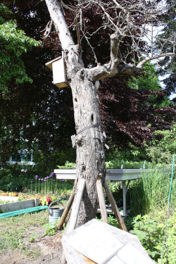 Wir sehen Habitatbäume im SUZ-Garten. So werden verrottende Bäume genannt, die als Lebensraum für Vögel, Käfer und Würmer dienen. Manchmal führt kein Weg daran vorbei, Bäume zu fällen. Allein 12 abgestorbene Buchen mussten im letzten Jahr in Bettina Stenders Garten dran glauben. Stellen die hinfällig gewordenen Bäume eine Gefahr für die Menschen dar, muss man handeln.