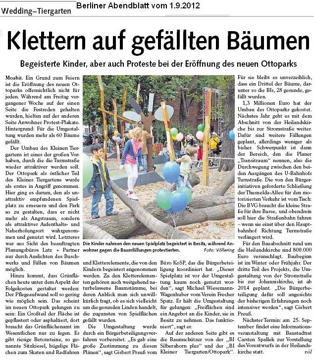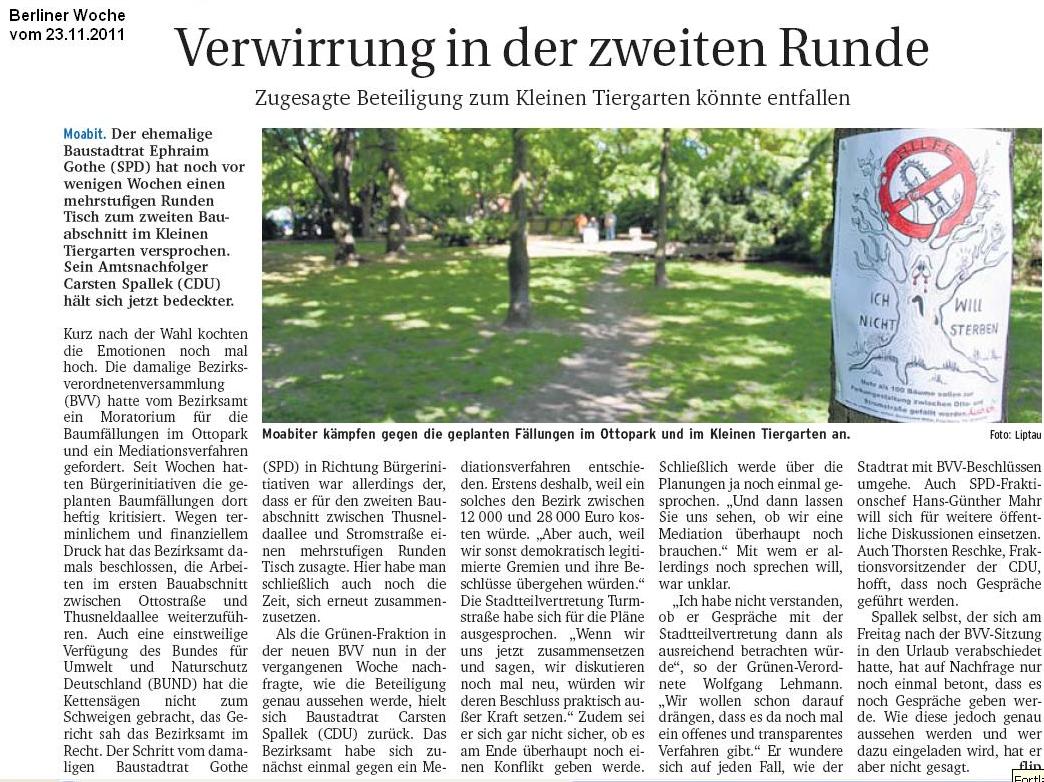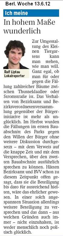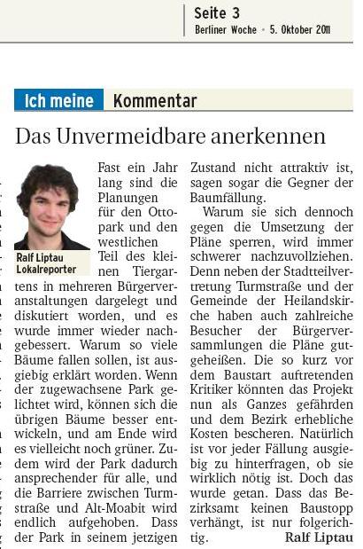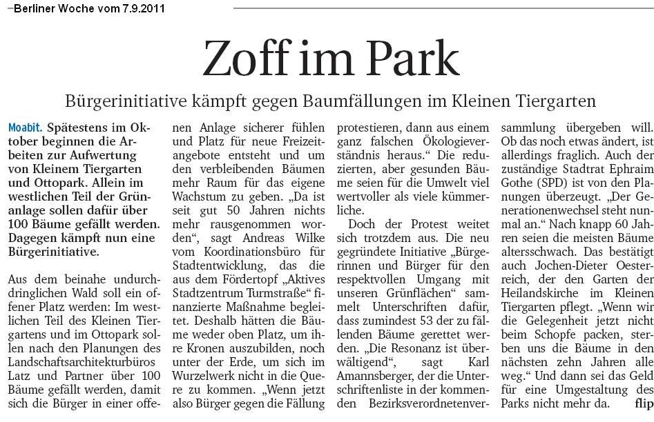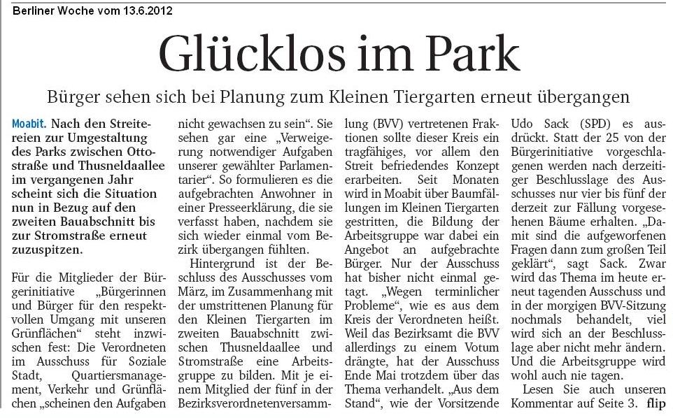Unter dem Titel "Glücklos im Park" hat die Berliner Woche am 13.6.2012 auf der Titelseite berichtet, s. auch Kommentar von Ralf Liptau. Die genannte Pressemitteilung liegt MoabitOnline bisher nicht vor.