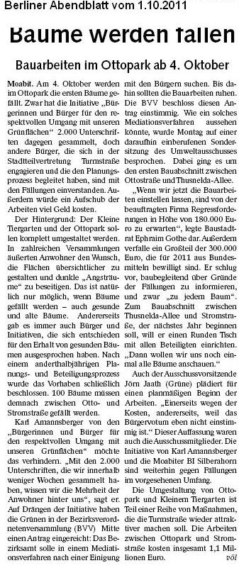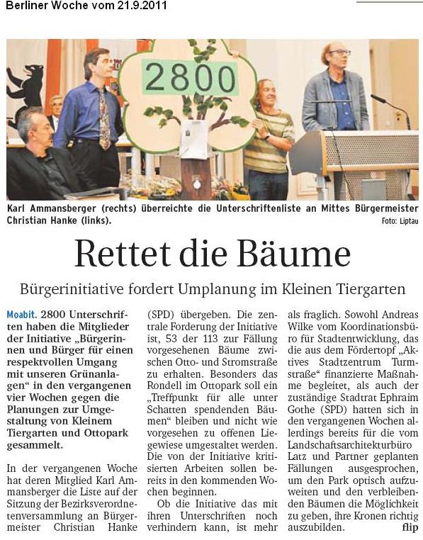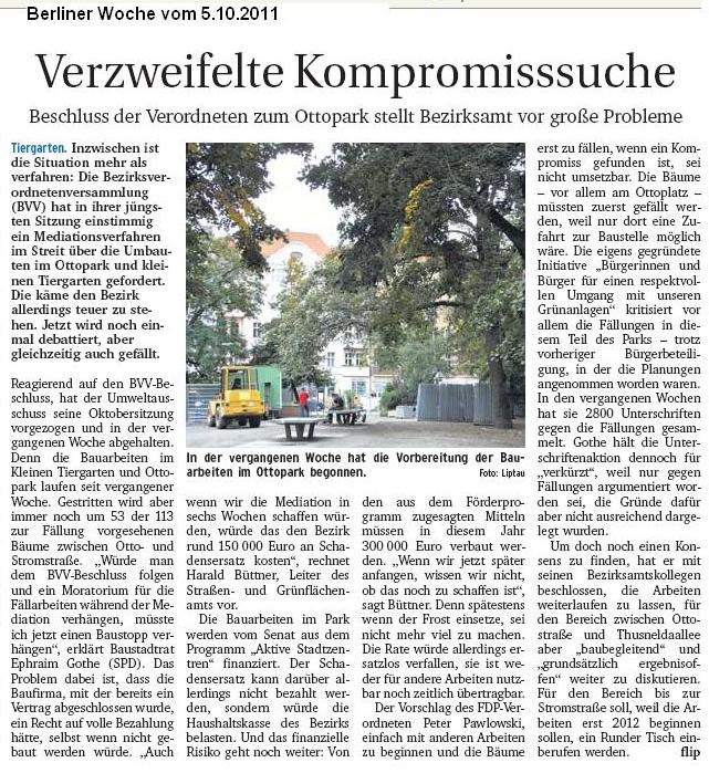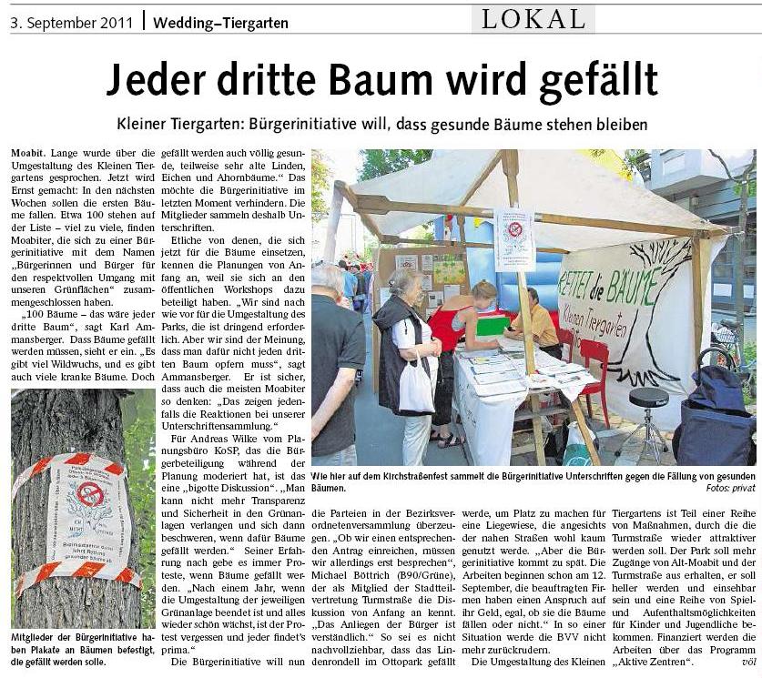 Und den Artikel im Berliner Abendblatt vom 1.10.11 "Bäume werden fallen", sowie in der Berliner Woche vom 5.10.11 "Verzweifelte Kompromisssuche" mit Kommentar.