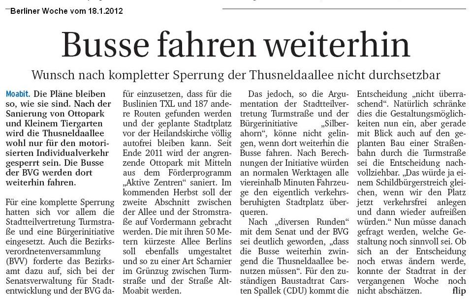 Link zu einer Kleinen Anfrage (DS 0016/IV) in der BVV Mitte, Thema: Umwelschutz, Außenluftverunreinigungen und Auswirkungen auf die Gesundheit. Hier wird auch ausführlich auf die Filterwirkung von Vegetation eingegangen. Und die Berliner Woche darüber, dass weiter Busse durch die Thusnelda Allee fahren werden.