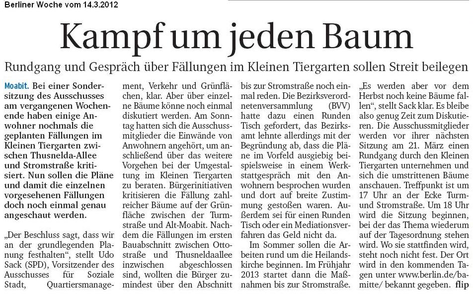 Antrag in der BVV (Drs. 0433/IV), damit drei Bäume zwischen Thusneldaallee und Stromstraße erhalten bleiben. Dieser wurde positiv abgestimmt mit den Stimmen von SPD und CDU, allerdings fand der Antrag von Bü 90/Grüne zum Erhalt von 16 Bäumen in diesem Bereich keine Mehrheit (s. Bericht von Rudi Blais im Landwehrkanal-Blog vom 28.9.12).