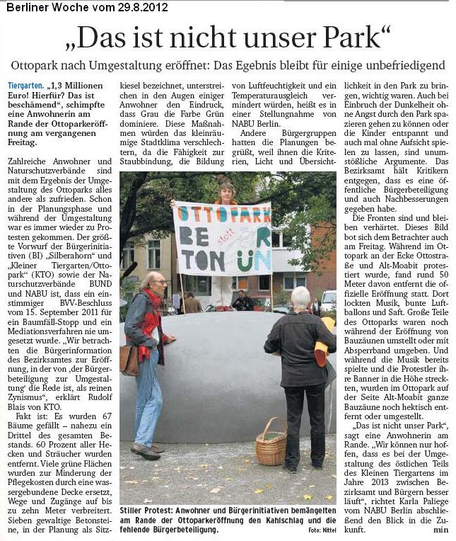 Ein kritischer Artikel vom Nabu Berlin am 24.8.2012, vom Landwehrkanal-Blog am 25.8., Berliner Woche vom 29.8., Berliner Abendblatt vom 1.9. und Berliner Morgenpost vom 28.8. (textgleich zur Berliner Woche).