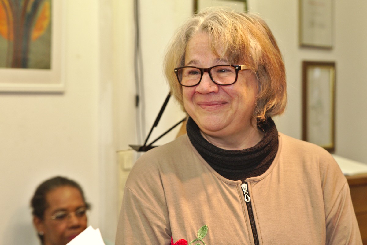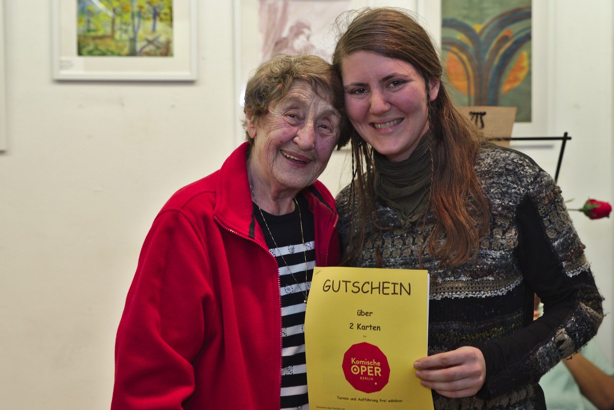 Die ersten Preisverleihungen fanden in der Kulturfabrik statt, in der Klara Franke, die Kiezmutter der Lehrter Straße, gemeinsam mit Nachbarn und „ihren jungen Leuten“ ihre Geburtstage feierte. Seit 2014 gibt Klaus-Peter Rimpel, Buchhändler der Dorotheenstädtischen Buchhandlung, dieser Nachbarschaftsveranstaltung Raum in seiner Kunststätte Dorothea. Der kleine Raum platzte aus allen Nähten so voll war es. Jutta Schauer-Oldenburg, die Laudatorin, hatte den Mädchenchor „Levetzow-Girls“ mitgebracht. Gegründet zur Unterstützung des Deutschunterrichts in der mittlerweile geschlossenen Notunterkunft Levetzowstraße sangen die 15 aus Afghanistan, Irak und Syrien stammenden Mädchen beeindruckend sicher bekannte deutsche Volkslieder und als Zugabe auf Wunsch von Ingrid Thorius „Die Moorsoldaten“, ein Lied, das Klara Franke geliebt hatte. Es folgten die Lobreden auf Sedanur Karaca und Sabine Lüdecke und Übergabe der Preise durch Michael Wiesemann-Wagenhuber vom Frechen Spatz e.V., je 2 Karten für die Komische Oper.