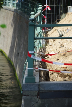 Die Sicherung einer solchen Wand ist nicht so einfach, wie es scheinen mag, denn auch der Denkmalschutz und die Standsicherheit der Bäume müssen hier beachtet werden. Natürlich könnte der unter Wasser befindliche hölzerne Teil durch eine davor gesetzte Stahlspundwand entlastet werden, so wie dies zum Beispiel am Bahnhof Friedrichstraße, beim Restaurant „Ständige Vertretung“, geschehen ist. Das sieht aber nicht nur unschön aus, sondern damit ist die hohe Mauer selbst noch lange nicht gegen Umfallen geschützt. Ob hier die Anker Stück für Stück freigelegt und durch neue ersetzt werden oder vom Land her eine zusätzliche Stahlspundwand zur Entlastung der alten Mauer eingebracht oder ob schlimmstenfalls das gesamte Erdreich hinter der Uferwand ausgebaggert und anschließend die Uferwand abgerissen und auf einem sicheren Fundament nach altem Vorbild völlig neu aufgebaut wird, müssen die Ingenieure noch klären. So heißt es auf der Tafel: „Zur Wiederherstellung der Standsicherheit der Uferwand „Wikingerufer“ wird bei der Senatsverwaltung für Stadtentwicklung Abteilung Tiefbau, gemeinsam mit dem Wasser- und Schiffahrtsamt Berlin, der Wasserbehörde des Landes Berlin, dem Landesdenkmalamt und dem Bezirksamt Mitte eine Lösung erarbeitet und umgesetzt.“ Wir werden uns also auf eine lange Sperrung einstellen müssen. Und eventuell auf einen aus Sicherheitsgründen ganz anders gestalteten Uferweg.