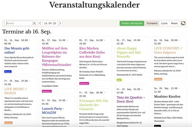Und einen Veranstaltungskalender, wie ihn Moabit noch nicht gesehen hat. Wir verknüpfen dafür unterschiedliche Kalender, zum Beispiel den des Hamburger Bahnhofs, des ZKUs, der Kulturfabrik, Kukumu und vielen anderen.