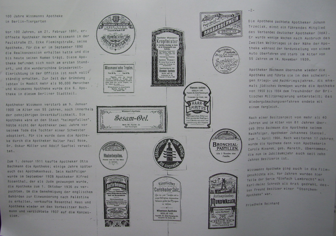 Zum 100jährigen Bestehen der Apotheke im Jahr 1991 hatte Carola Minarek eine Chronik mit alten Fotos und Werbeanzeigen herausgegeben - es war ihr 10jähriges Jubiläum. In diesem Text von Friedhelm Reinhard heißt es, dass der Apotheker Hermann Wissmann seine Apotheke am 21. Februar 1891 eröffnete, nachdem er im September 1890 die Konzession erhalten hatte. Es war die sechste Apotheke im Stadtteil Moabit. 1911 kaufte sie der Apotheker Otto Bachmann, einige Jahre später auch das Haus. Sein Nachfolger wurde im September 1928 der Apotheker Alfred Rosenthal. 1936 wurde er als Jude gezwungen die Apotheke zu verpachten. Um eine Genehmigung zur Einwanderung nach Palästina zu erhalten, verkaufte Rosenthal Haus und Apotheke wieder an den Vorbesitzer Bachmann - sehr wahrscheinlich mit großem Verlust - und verzichtete 1937 auf die Konzession.