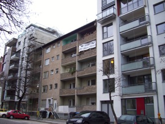 Viele Mieter/innen hatten wegen jahrelangem Baulärm die Miete gemindert. Gegen diese führt der Eigentümer, Herr Stach, nun Prozesse. Er kündigte fristlos wegen Mietminderung, selbst Mieter/innen, die schon viele Jahre, zum Teil Jahrzehnte in den Häusern wohnen. Es gibt vielfältige Probleme der einzelnen. Das macht die gemeinsame Organisation nicht einfach. (Und so soll die Häuserreihe in der Calvinstraße mal aussehen, von links nach rechts: Melanchthonstr. 16, Calvinstr. 21 - 19, auch dieses Bild wurde entfernt).