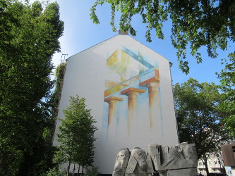 1988 entstand anstelle der abgerissenen Synagoge ein beeindruckendes, mehrteiliges Mahnmal, das an die dunkle Geschichte dieses Ortes erinnerte. Dem setzten nun die Bewohner*innen des Nachbarhauses etwas Neues gegenüber: Als sie erfuhren, dass das Gebäude neu gestrichen wird, beschlossen sie, ein Wandbild anzubringen. Eine Kunstlehrerin in dem Haus organisierte die Malaktion. Seit einigen Tagen leuchtet es nun direkt auf die Gedenkstätte und ergänzt diesen Mahnort perfekt.